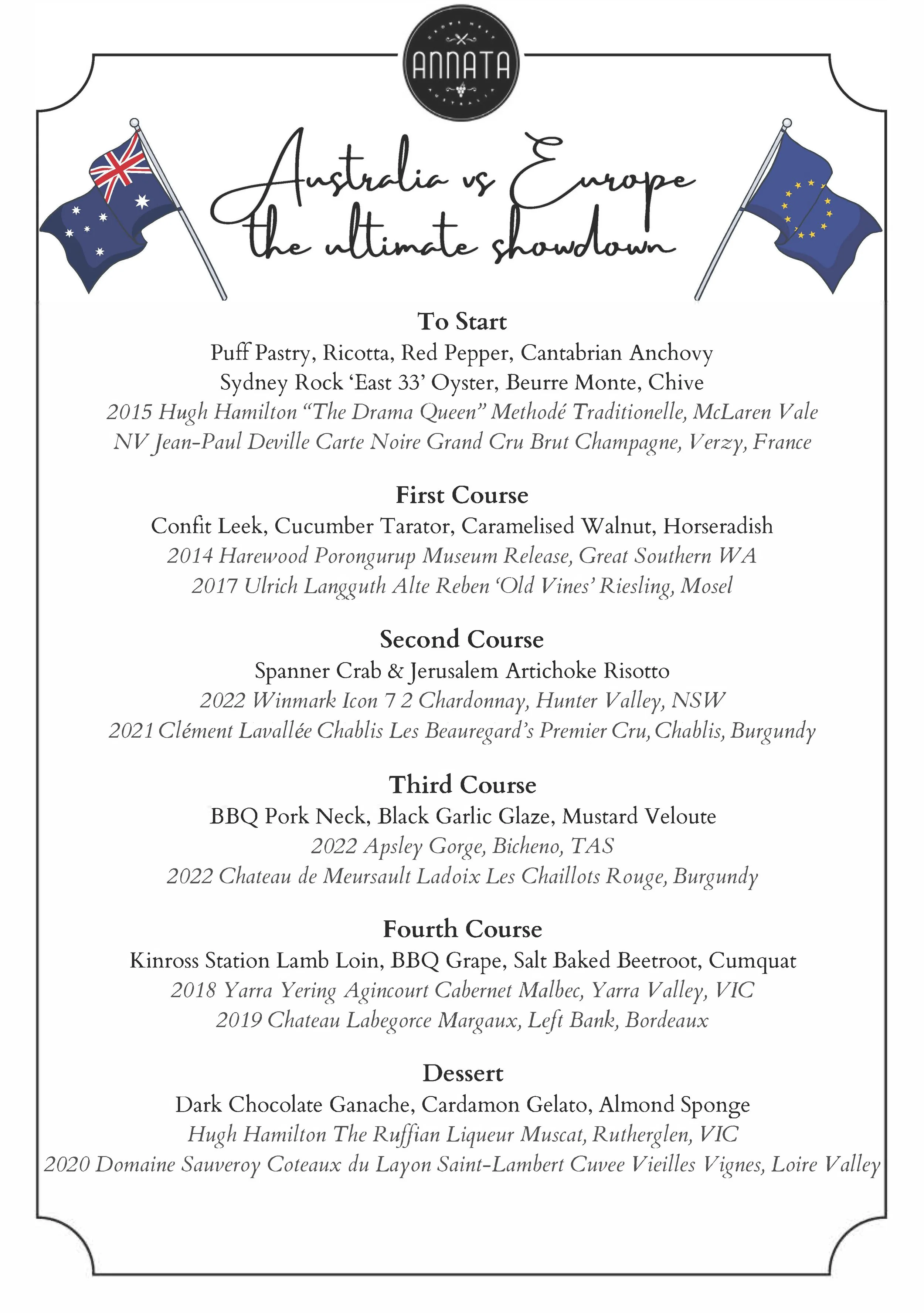 Annata Restaurant invites you to a bold and brilliant evening of culinary finesseand international wine rivalry at our latest wine degustation event: Australian vs European Wines, on Wednesday 28th and Thursday 29th May, from 7:00pm.