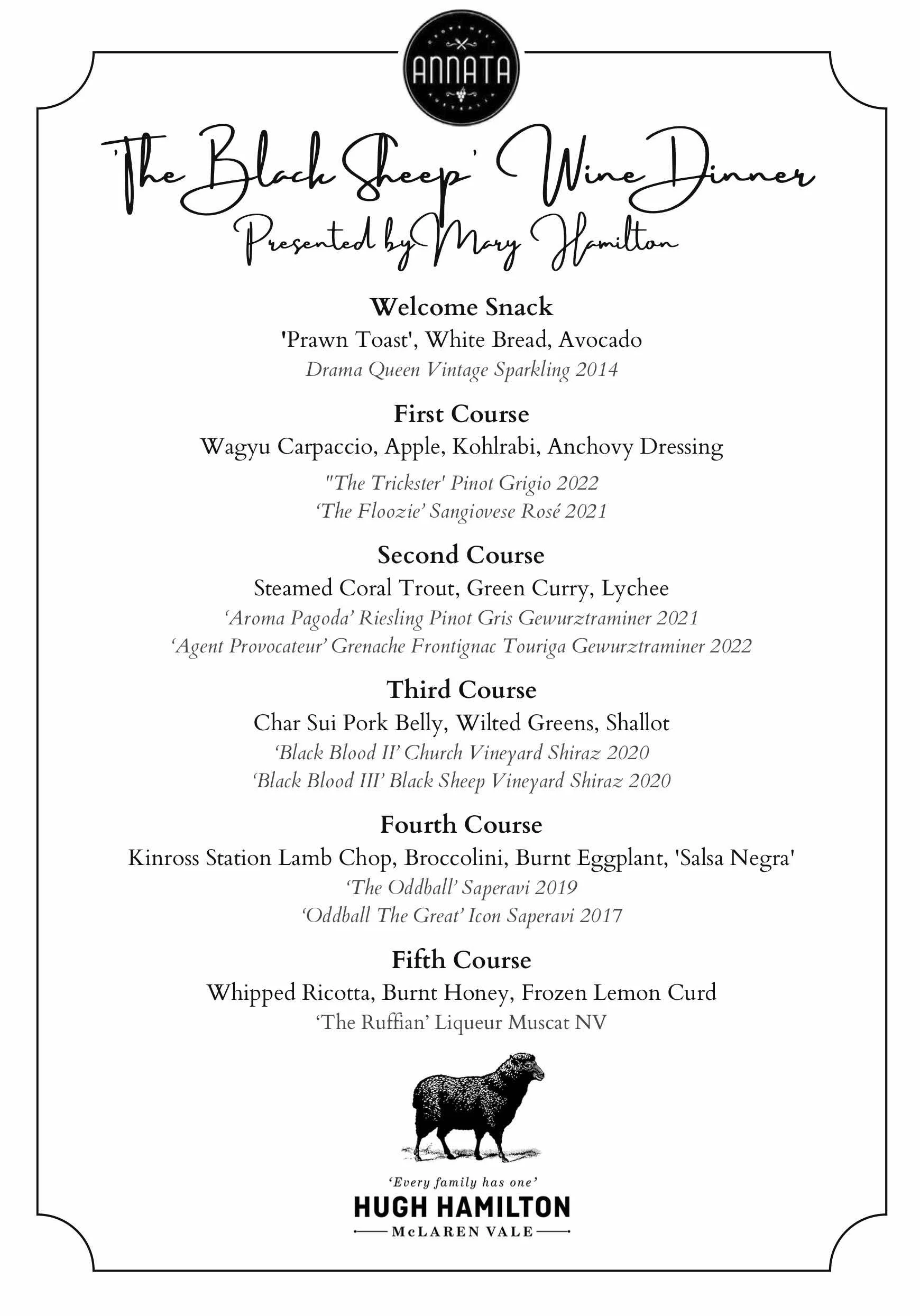 Executive Chef Jordon Garcia has created a stunning five-course Australian Menu to complement the ten superb wines recommended by Mary Hamilton. Guests also will have the opportunity to sample Pure Black, the pinnacle of the Black Sheep story that embodies the bold spirit of the Hugh Hamilton legacy.