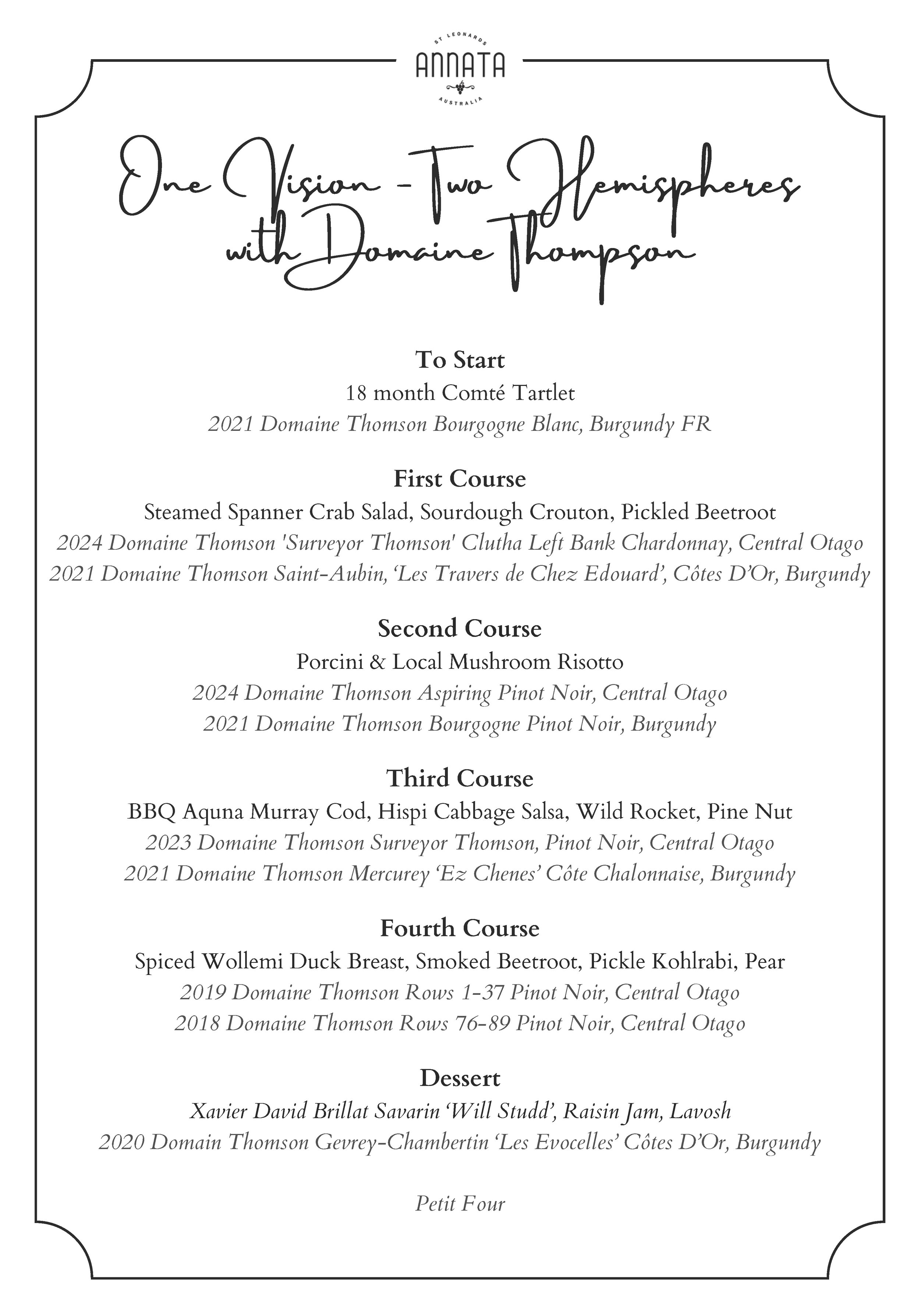 Join us for a rare and intimate wine dinner celebrating Domaine Thomson, an extraordinary family estate spanning Central Otago, New Zealand and Burgundy, France.
