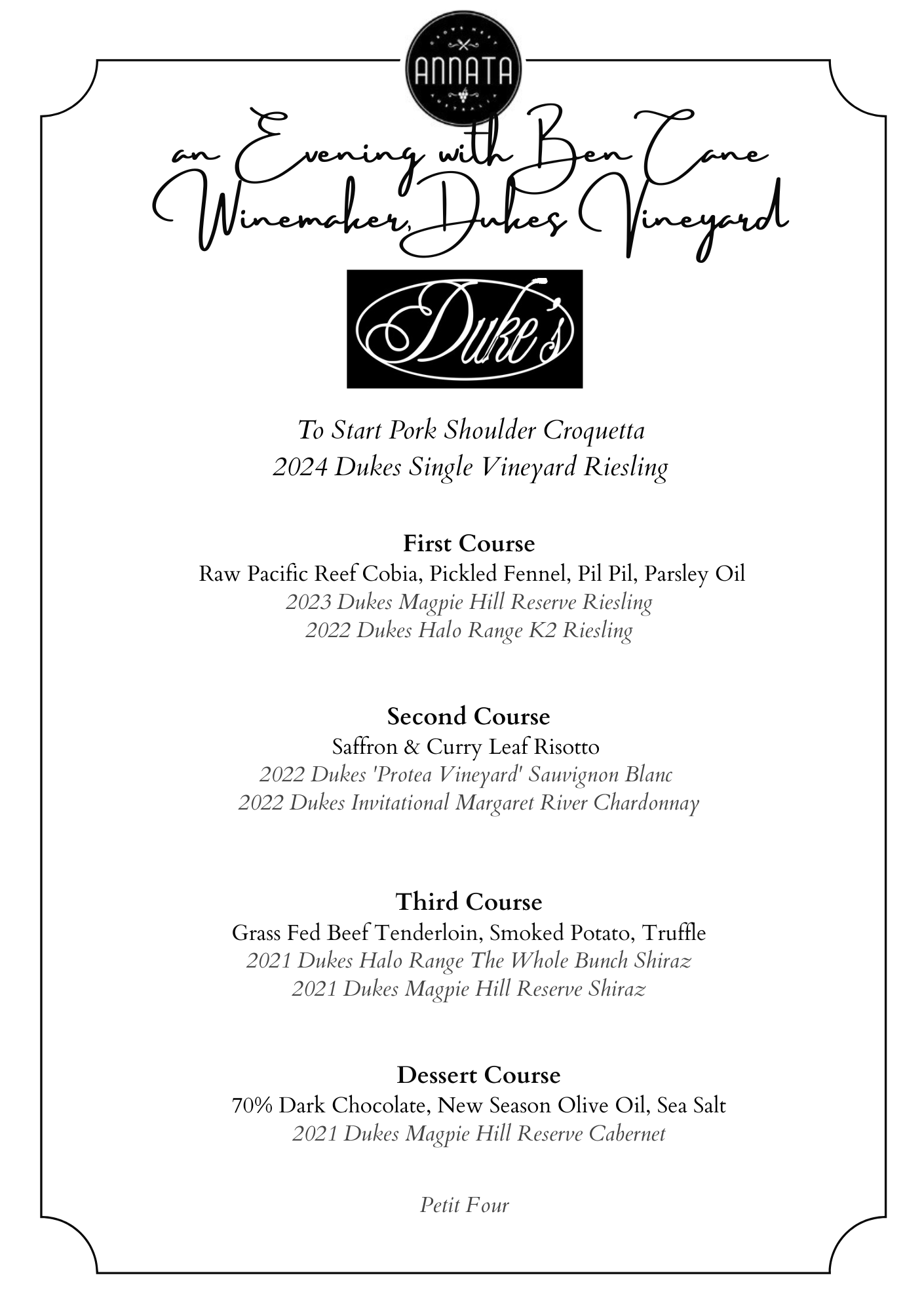 Join us at Annata for a fabulous four-course winemaker’s dinner with Ben Cane. His Duke’s Vineyard winery is an award-winning, ten-hectare vineyard in the cool-climate Great Southern wine region of WA producing dry Rieslings, Cabernet Sauvignon and Shiraz. The vineyard is a unique site that sits at the feet of the ancient granite Porongurup peaks. Ben Cane and his partner purchased Duke's Vineyard when founders Duke and Hilde Ranson retired in 2022. Ben was previously the chief winemaker at top labels in Australia and California. Duke's Vineyard was awarded the industry's most prestigious prize when their 2017 Magpie Hill Reserve Riesling was named Australian Wine of the Year by James Halliday in 2019. It was the first time a white wine scored 99 out of 100 points.